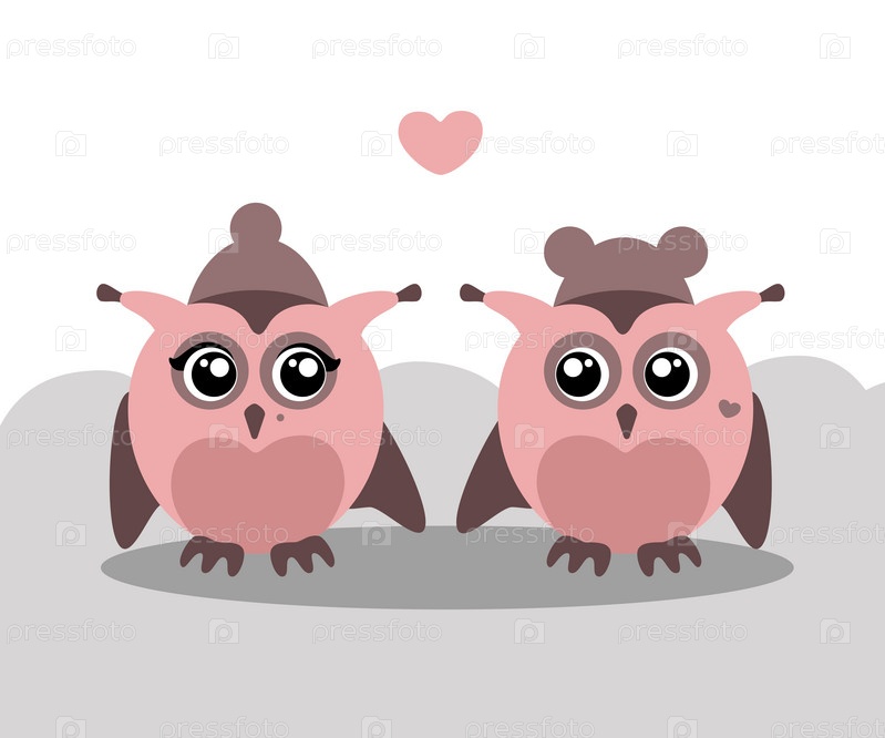 Валентинка с двумя милыми девушками-совами с сердечками на простом светлом фоне для иллюстрации лесбиянок