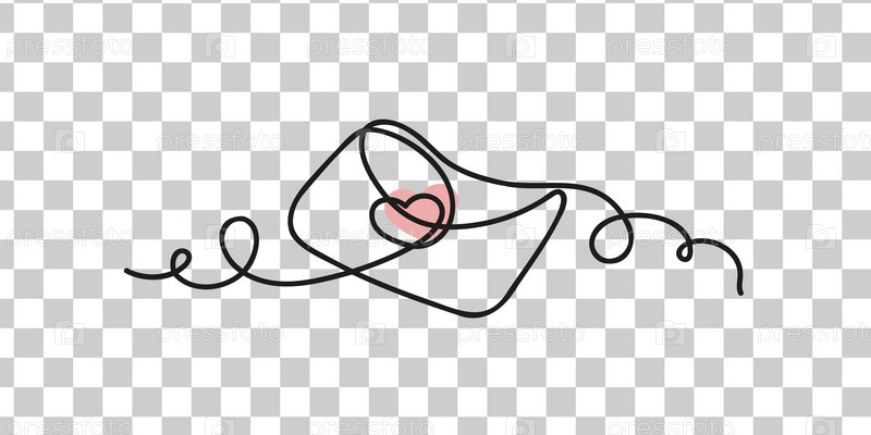 Конверт с одной линией с сердечным векторным любовным посланием в линейном искусстве без фона, линия визитной карточки ко Дню святого Валентина