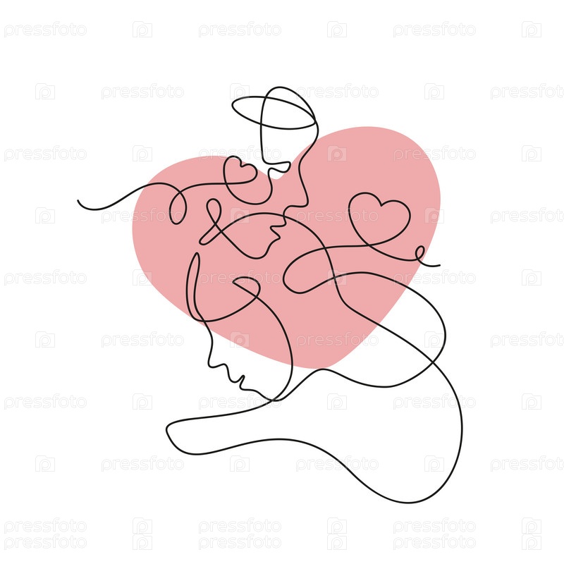 Влюбленные с однолинейными векторными лицами парня и девушки в линейном искусстве на фоне розового Дня святого Валентина