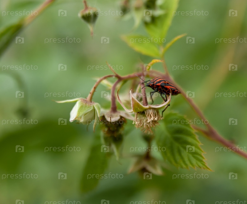 Красный полосатый жук или итальянский клоп на ветке зеленой малины