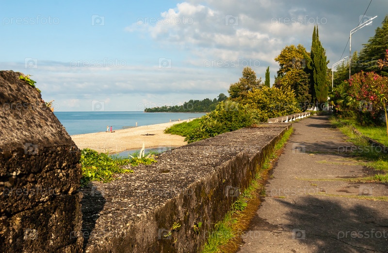 Тротуар у моря, магнолия. Солнечный галечный пляж с редкими отдыхающими. Новый Афон, Абхазия