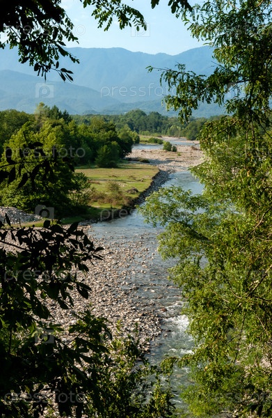 Горная река, окруженная зелеными зарослями, каменное, галечное дно, горы. Село Моква, Абхазия