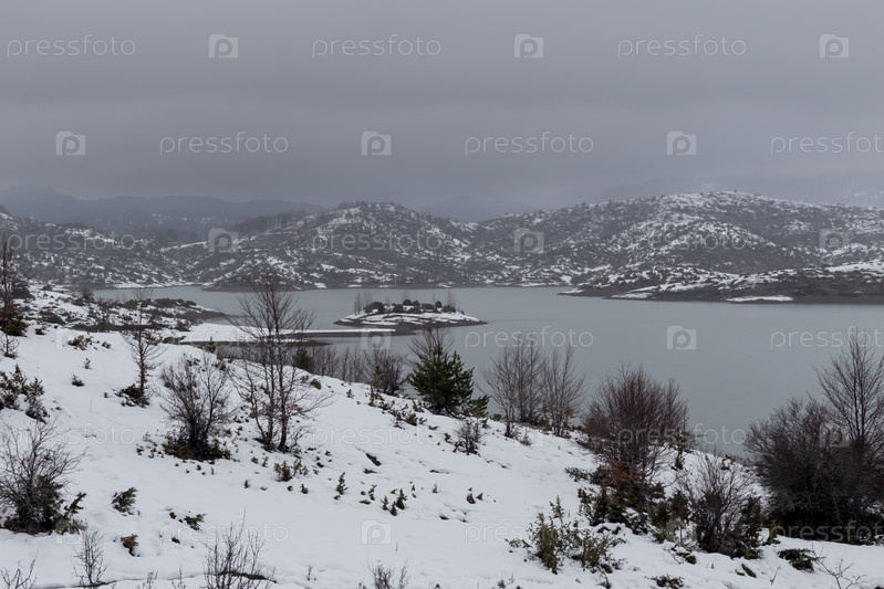 Озеро источников Аоос в горах (регион Эпир, Греция) зимой в пасмурный день