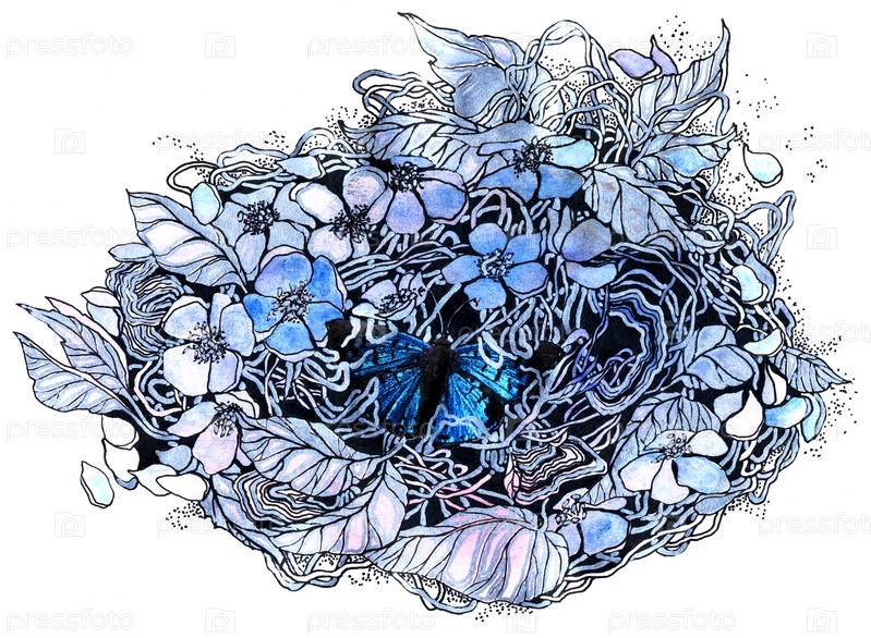 Элегантная цветочная композиция из линейных цветов и листьев. Нарисованные от руки цветы с бабочкой. Дизайн свадебного приглашения, конвертов, шаблона поздравительной открытки. иллюстрация