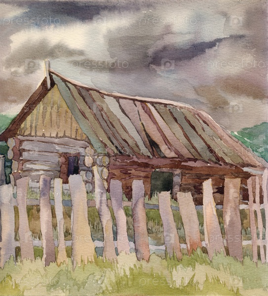 Старый деревянный дом в деревне в летнем пейзаже. Акварельная иллюстрация