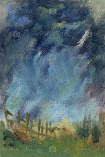 Гроза в природе. Картина маслом. Вертикальная иллюстрация