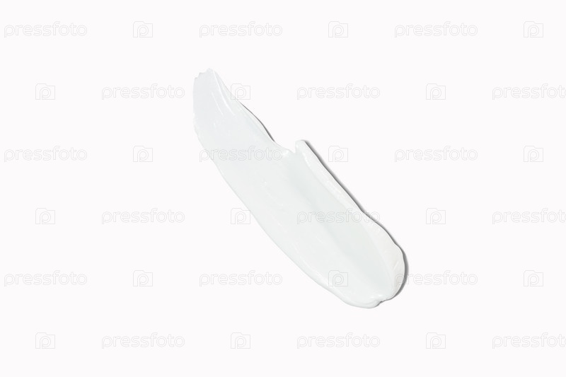 Мазок косметического продукта белый увлажняющий лосьон, выделенный на белой, выдавленной и размазанной части тестирования крема для ухода за кожей