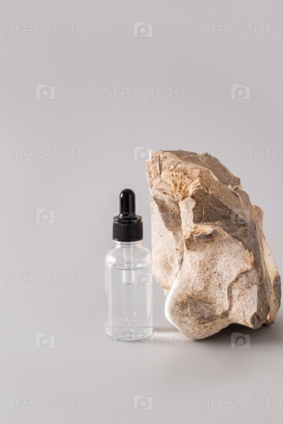 Сыворотка для ухода за сухой кожей лица в косметическом флаконе с капельницей на сером фоне возле натурального камня. Вертикальный вид. макет