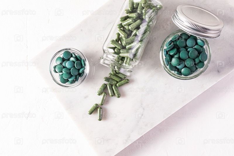 Круглые сине-зеленые таблетки натуральных водорослей спирулины в банковском стекле на белом фоне. медицинская банка с капсулами из морских водорослей. Натуральные пищевые добавки