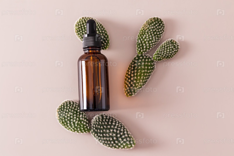 Косметическая бутылочка-капельница из темного стекла с увлажняющим, омолаживающим лицом на пастельном фоне с листьями кактуса. Антивозрастной уход