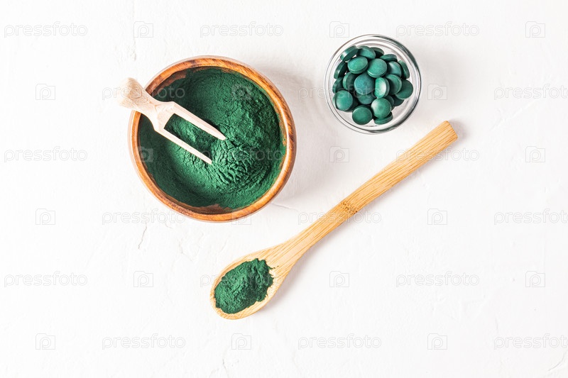 Деревянная миска, ложка и совок, наполненные порошком зеленых водорослей спирулины на белом фоне. Стеклянная банка с таблетками спирулины. Вид сверху. Детокс