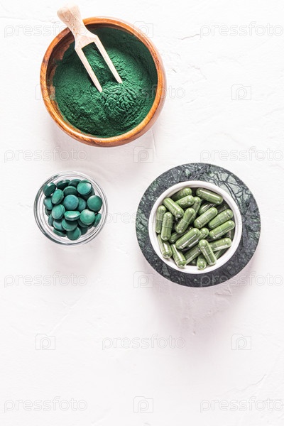 Порошок зеленых водорослей спирулины, капсулы и таблетки в банках на белом рельефном фоне. Вертикальный вид. Копия помещения. Детокс
