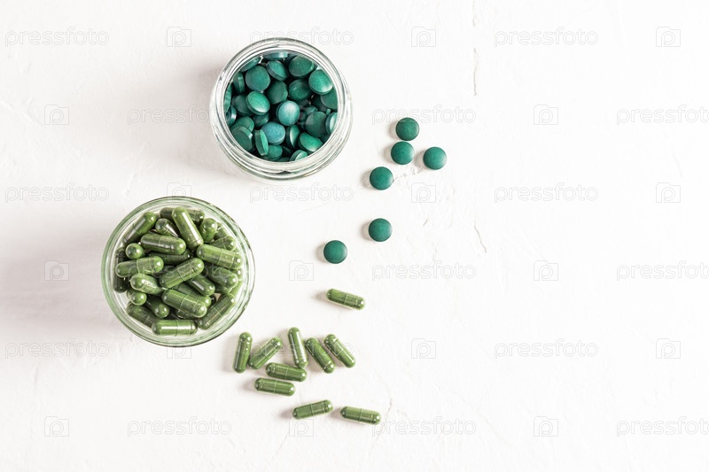 Две стеклянные банки, наполненные капсулами и таблетками органической спирулины на белом текстурированном фоне. Вид сверху. Естественное очищение организма