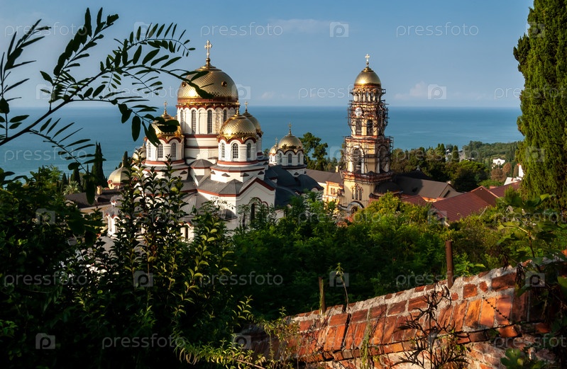 Монастырь Симона Канонита имеет оранжевую кирпичную ограду, буйную зелень, море. Нововизантийский стиль, 1875 год. Новый Афон, Абхазия