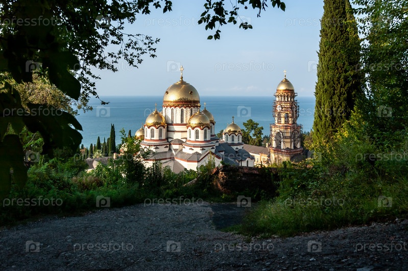 Сверкающие купола Новоафонского монастыря Симона Канонита. Вид с горной дороги. Новый византийский стиль 1875 года. Абхазия