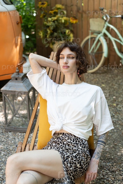 Молодая красивая женщина позирует в кресле на улице летом