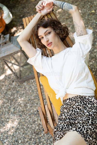 Молодая красивая женщина позирует в кресле на улице летом