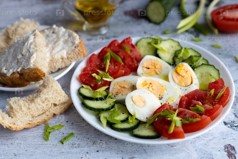 Свежие помидоры и огурец с яйцом в тарелке