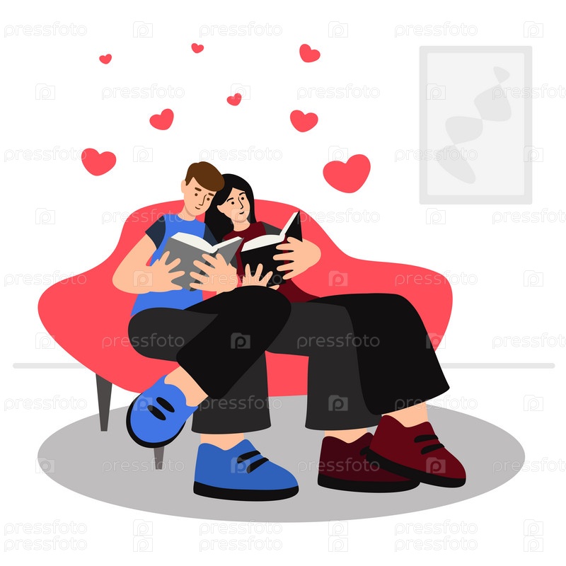 Пара читает книги вместе, сидя на диване в доме, векторная любовь