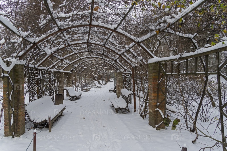Заснеженная пергола в парке. Аптекарский Огород (филиал ботанического сада МГУ). Москва. Конец ноября, пасмурный день
