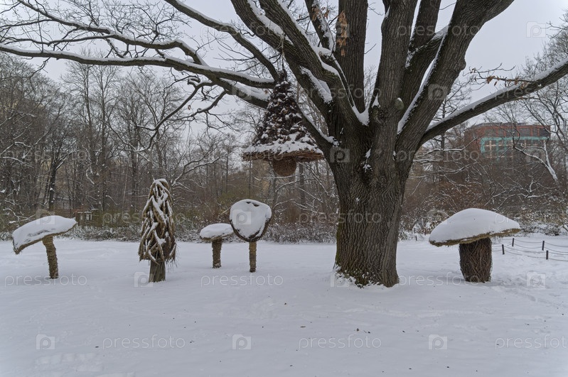 Засыпанные снегом забавные парковые скульптуры (огромные грибы, сделанные из веток). Аптекарский Огород (филиал ботанического сада МГУ). Москва. Конец ноября, пасмурный день