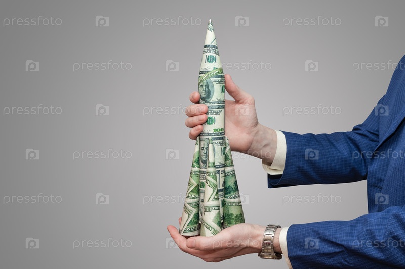 Мужчина держит ракету из бумажных долларов на изолированном сером фоне