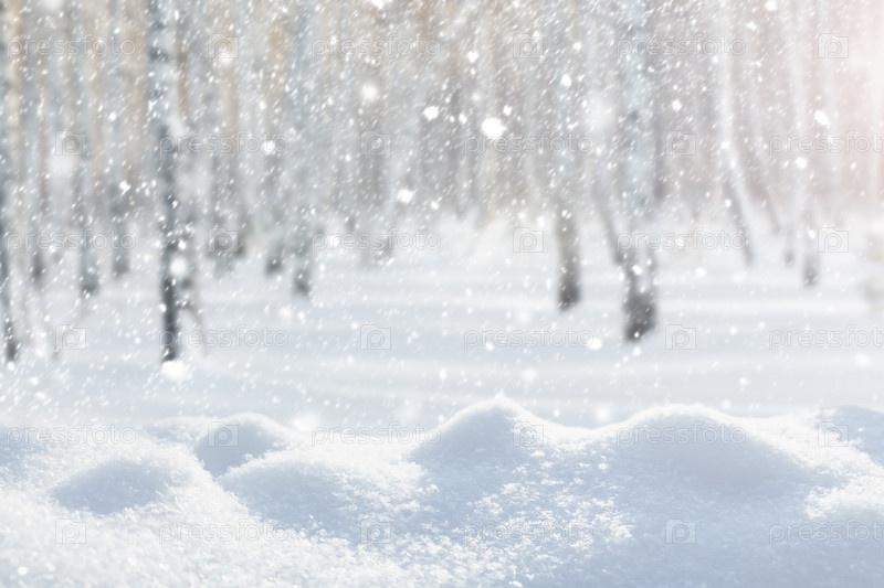 Снегопад в лесу на фоне берез