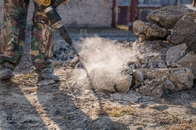 Рабочий разбивает бетон отбойным молотком