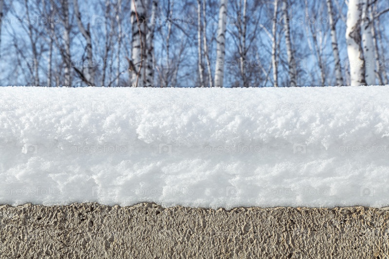 Толстый слой свежего снега лежит на бетонном фундаменте