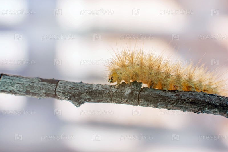 Желтая пушистая гусеница ползает по ветке. Макросъемка..Макросъемка. (Spilosoma Virginica) вид моллюсков подсемейства Arctiinae