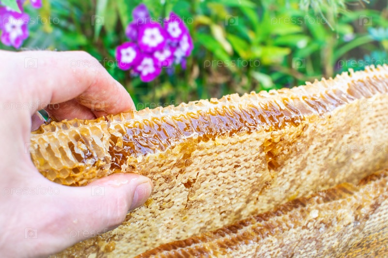 Пчелиные соты с медом в мужской руке на фоне листьев и цветов