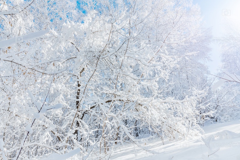 Березы покрыты инеем на фоне голубого неба