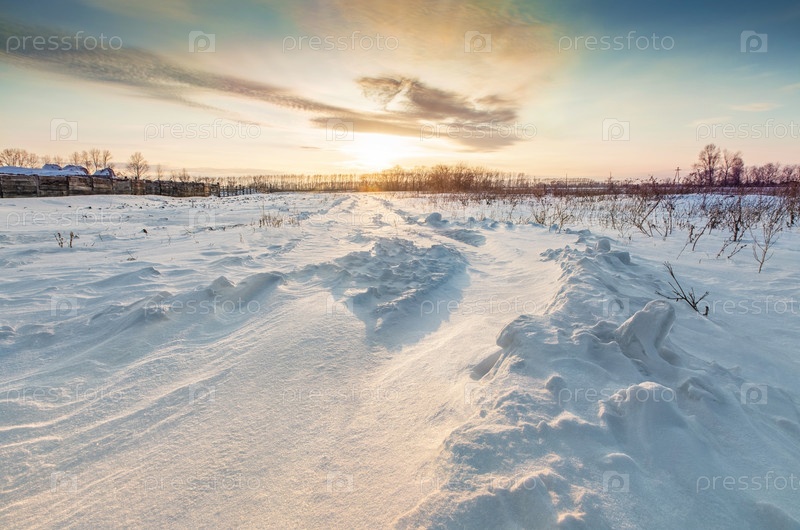 Зимний закат в сельской местности. Снежный пейзаж с дорогой, покрытой снегом