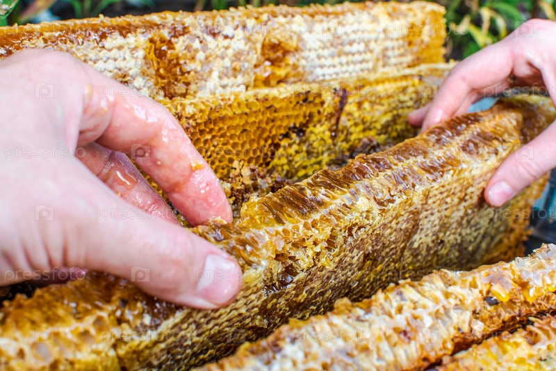 Медовые соты в руках мужчины и женщины. Работа на пасеке