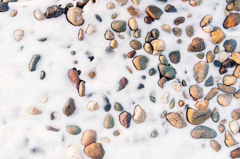 Фон из камней и свежего снега. Снег лежит на каменном берегу