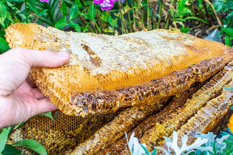 Пчелиные соты с медом в мужской руке на фоне листьев и цветов