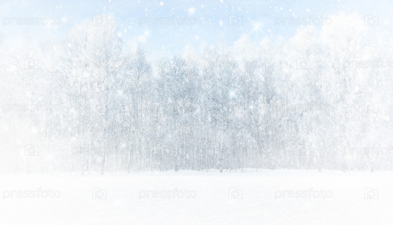 Сильная метель в березовой роще. Зимний абстрактный пейзаж. Фон от падающего снега. Панорамное изображение