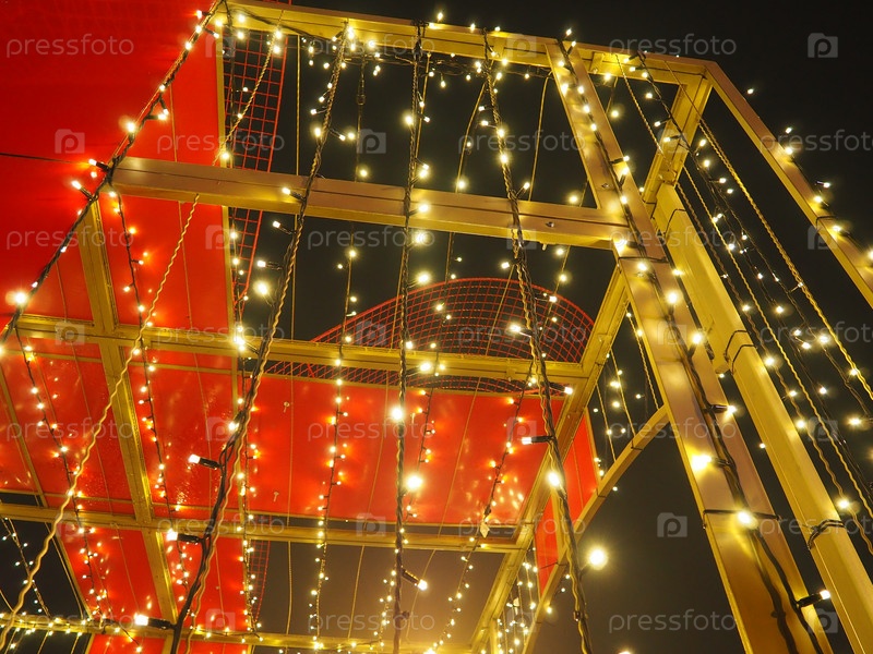 Красивые гирлянды украшают центр города. Уличные украшения к Новому году и Рождеству. Светящиеся многочисленные желтые и белые лампочки в темноте. Разноцветный декоративный дизайн и боке