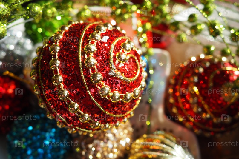 Разноцветные стеклянные блестящие шарики. Новогоднее рождественское украшение. Праздничный дизайн. Красные, синие, золотые, белые, зеленые полосатые шары. Фон в канун Рождества и Нового года. Крупным планом рождественские украшения