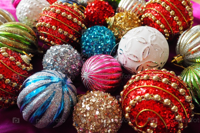 Разноцветные стеклянные блестящие шарики. Новогоднее рождественское украшение. Праздничный дизайн. Красные, синие, золотые, белые, зеленые полосатые шары. Фон в канун Рождества и Нового года. Крупным планом рождественские украшения