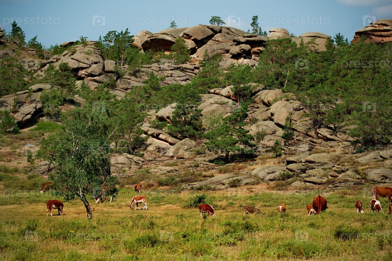 Восточный Казахстан. Мирно пасущиеся коровы в национальном природном горном парке Баянаул