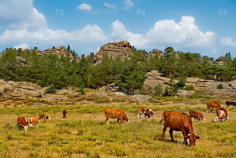 Восточный Казахстан. Мирно пасущиеся коровы в национальном природном горном парке Баянаул