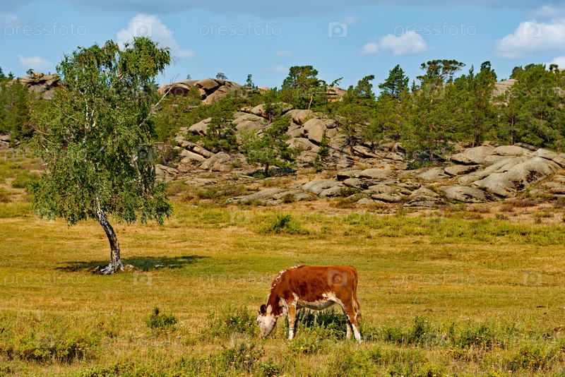 Восточный Казахстан. Мирно пасущиеся коровы в национальном природном горном парке Баянаул