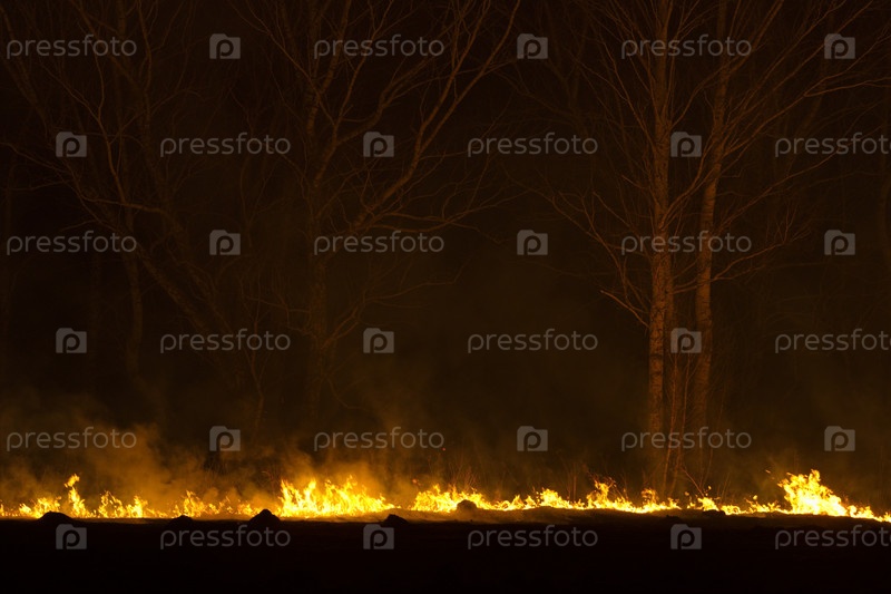 Россия. Юг Западной Сибири. Ночной пожар в весеннем лесу. Поджоги вызывают ужасные пожары на полях и в лесах во время засушливой весны, которые очень трудно потушить