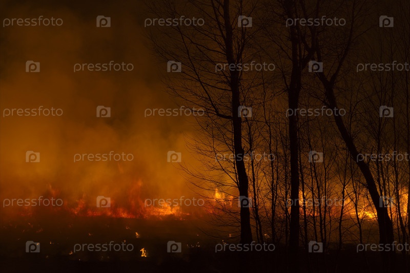 Россия. Юг Западной Сибири. Ночной пожар в весеннем лесу. Поджоги вызывают ужасные пожары на полях и в лесах во время засушливой весны, которые очень трудно потушить