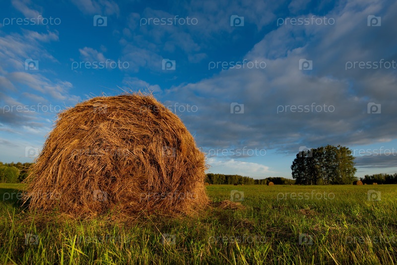 Россия. Западная Сибирь. Летний солнечный вечер на скошенных полях близ города Омска