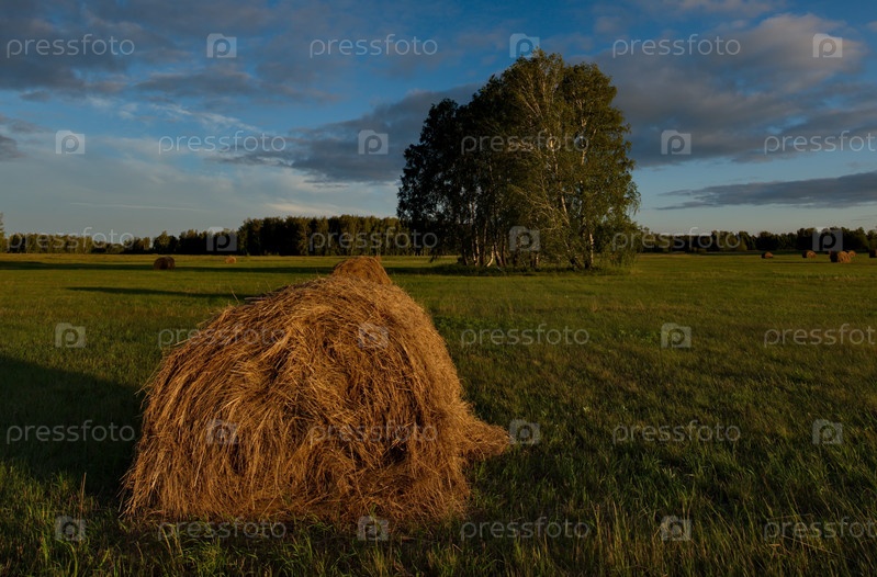 Россия. Западная Сибирь. Летний солнечный вечер на скошенных полях близ города Омска