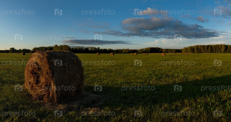 Россия. Западная Сибирь. Летний солнечный вечер на скошенных полях близ города Омска