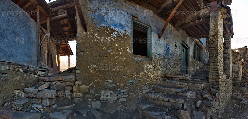 Россия. Северо-Восточный Кавказ, Дагестан. Вид на Кавказские горы через дверной проем заброшенного дома в горной деревне Хуштада. Традиционно все дома построены из камня