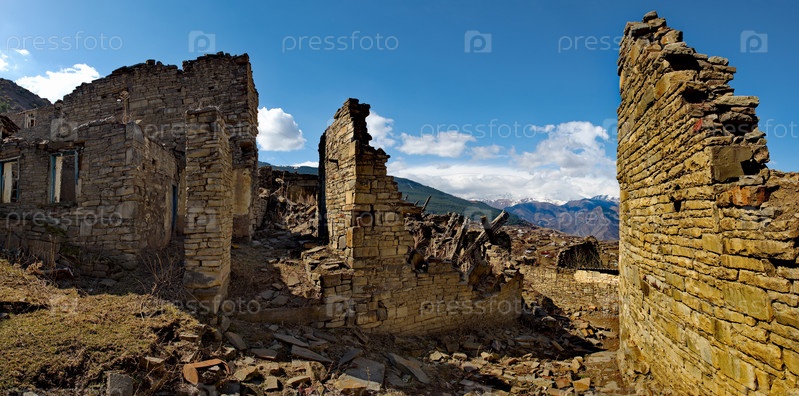 Россия. Северо-Восточный Кавказ, Дагестан. Вид на Кавказские горы через дверной проем заброшенного дома в горной деревне Хуштада. Традиционно все дома построены из камня